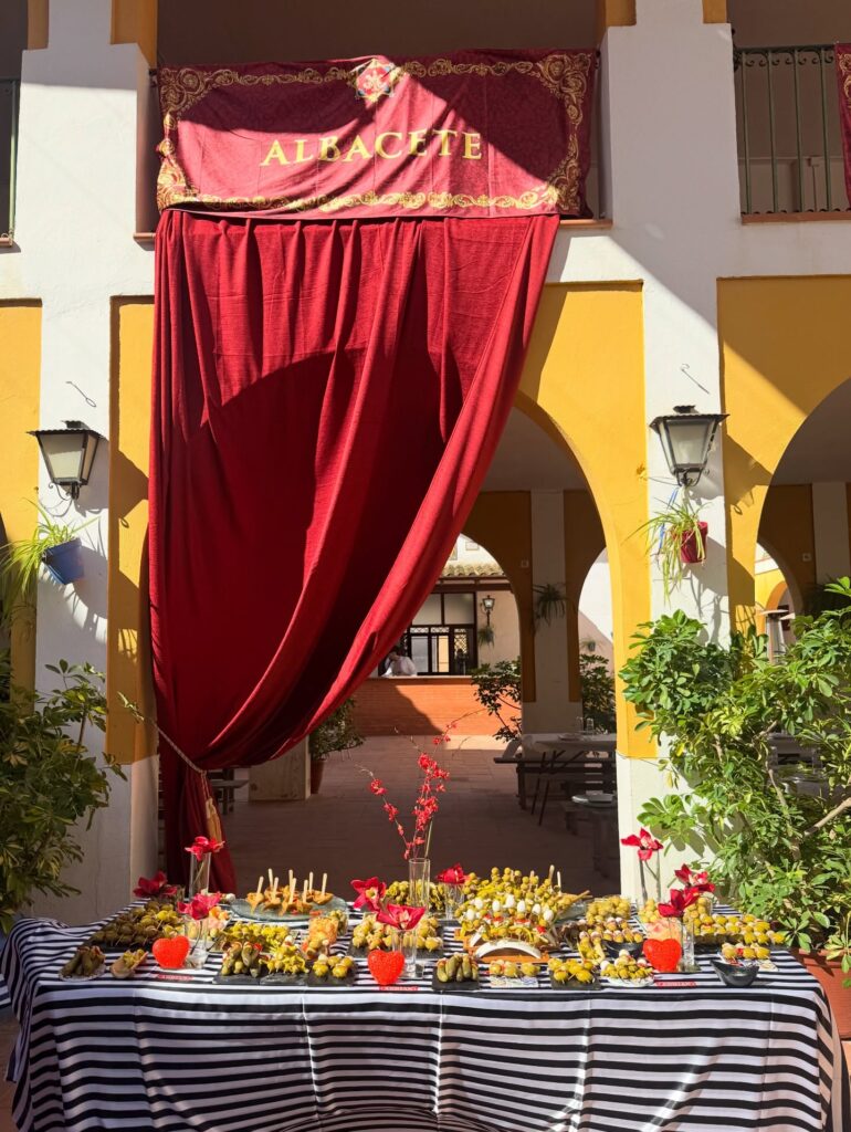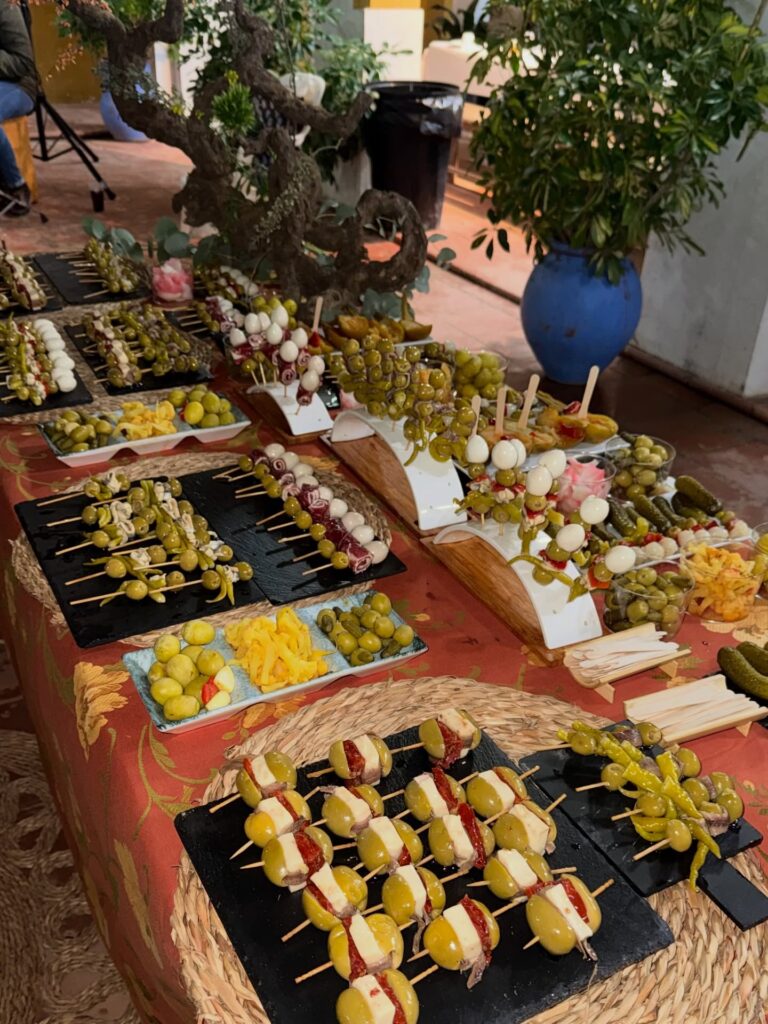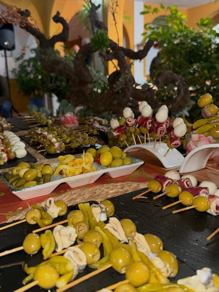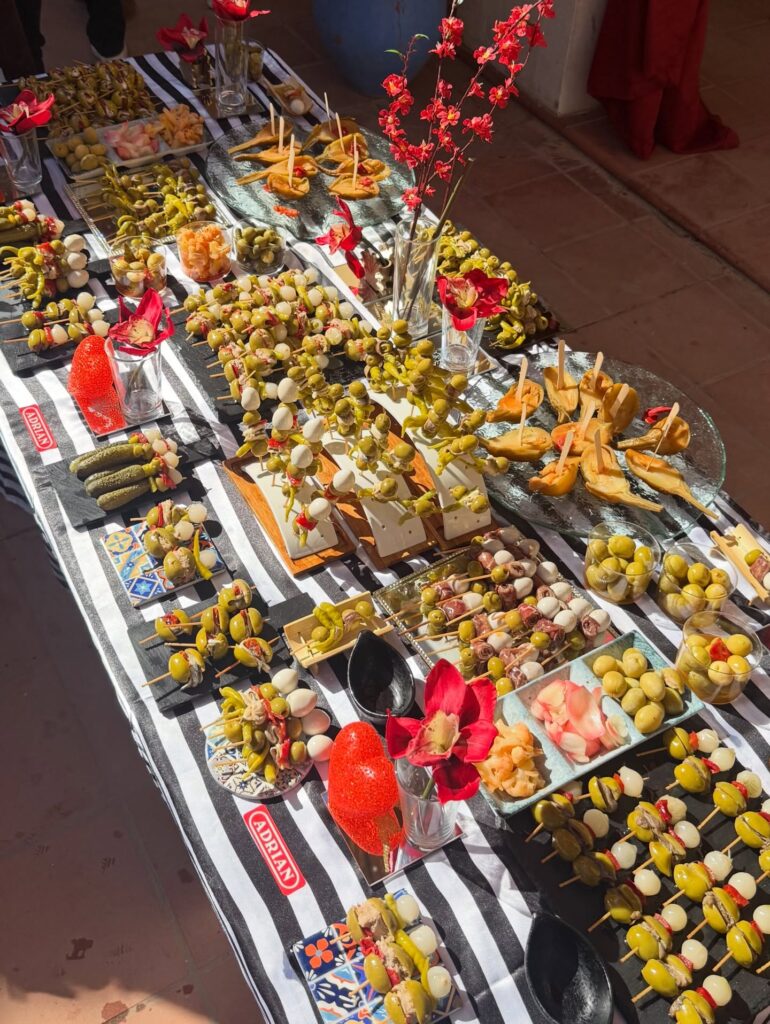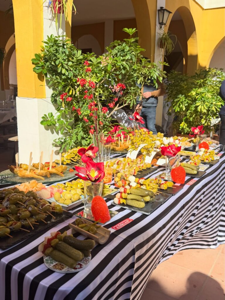 Montamos varias mesas con una selección especial de nuestras aceitunas aliñadas, gildas preparadas al momento y una variedad de encurtidos pensados para compartir. Porque si algo caracteriza al Rocío es precisamente eso: compartir. Compartir camino, compartir mesa y compartir momentos que se quedan para siempre en el recuerdo.